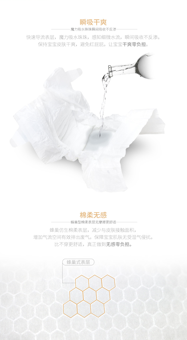 無紡布面料:精選極致柔軟穿孔無紡布面料,清爽透氣,質(zhì)地輕柔,有效吸收尿液和稀便,給寶寶zui大限度的柔軟體驗(yàn)。