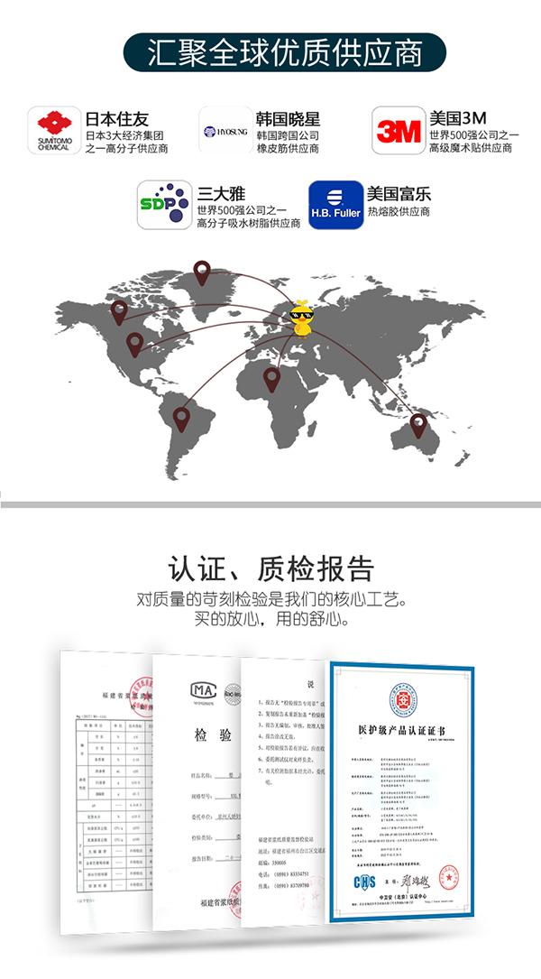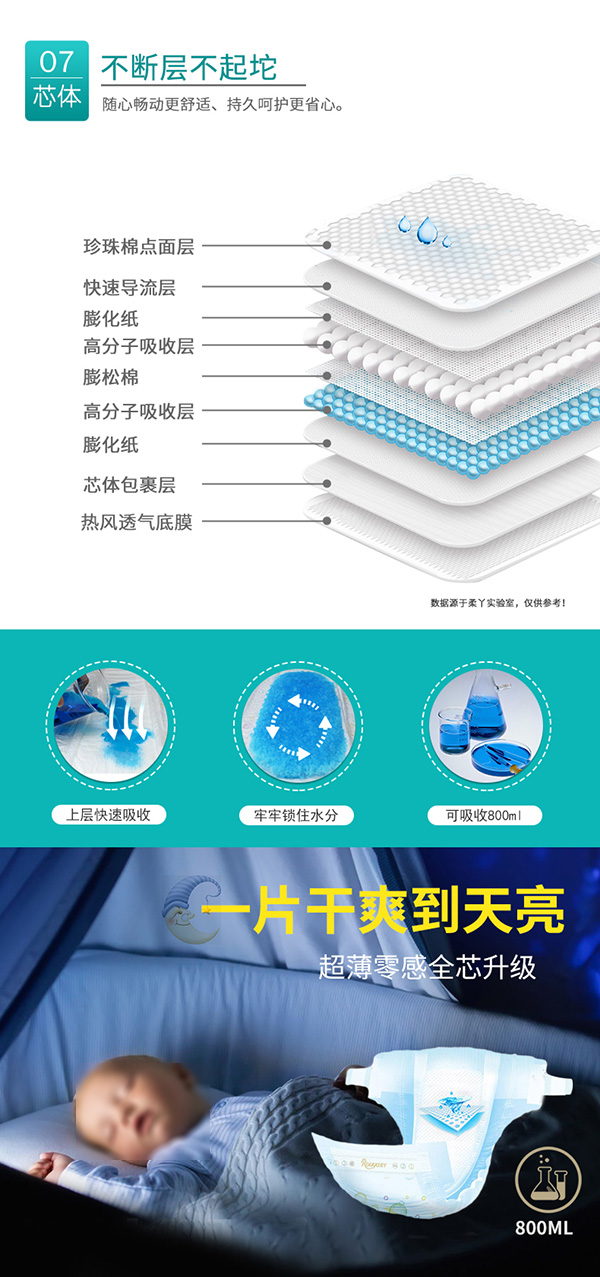 進(jìn)口高分子結(jié)構(gòu),可以吸收約自身重量30倍的水分,保持屁屁持久干爽