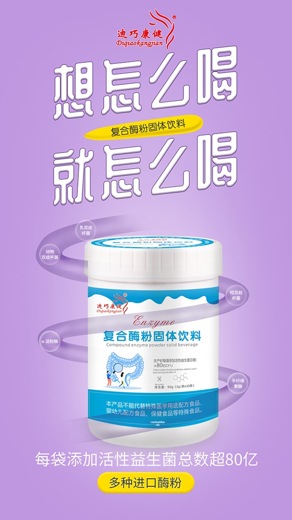 迪巧康健復合酶粉固體飲料,嚴選多種天然原料,源頭把控,品質(zhì)保證!富含多種優(yōu)質(zhì)菌種,如乳雙歧桿菌、動物雙歧桿菌、短雙歧桿菌等等,生產(chǎn)時每袋添加活性益生菌總數(shù)≥80億cfu,同時特別添加α-淀粉酶、半纖維素酶等等,配比科學,營養(yǎng)均衡,更以嚴格工藝加工而成,層層監(jiān)督檢測,品質(zhì)過硬,易溶解、易消化、好吸收,給力護成長!