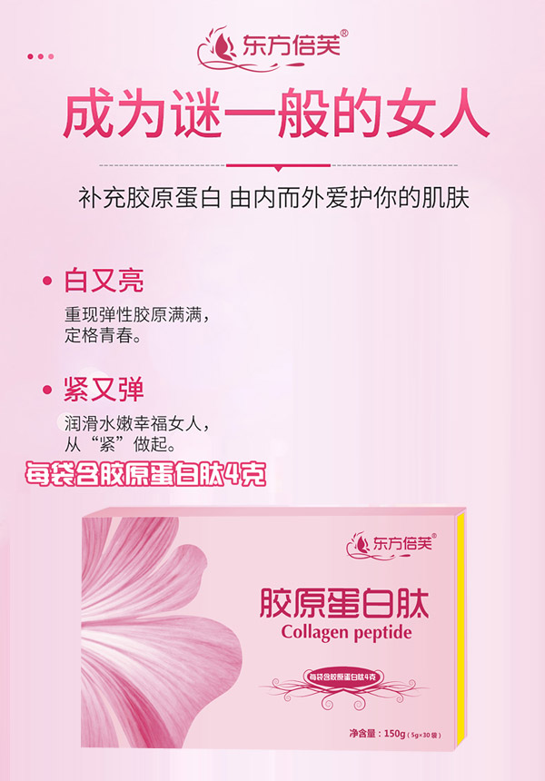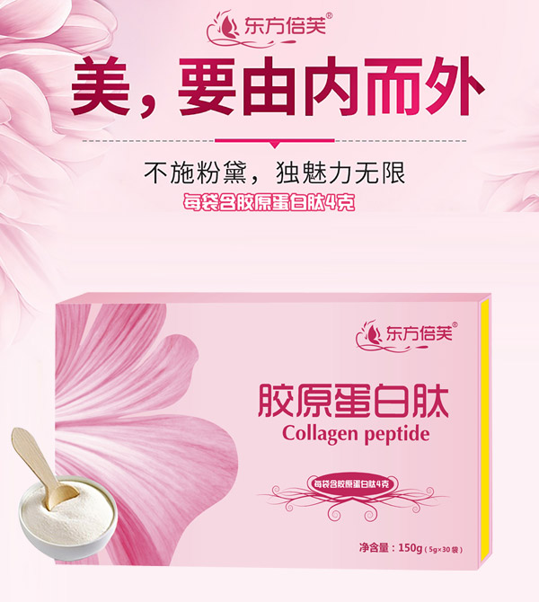 東方倍芙膠原蛋白肽,為千萬愛美女性精心打造,至臻好品質(zhì)!精選多種進口原料,源頭嚴格把控,品質(zhì)保證!嚴選法國深海魚類膠原蛋白,科學(xué)配方,營養(yǎng)豐富,每袋含膠原蛋白肽4g,給肌膚由內(nèi)而外的貼心細致呵護,讓你時刻散發(fā)無限魅力!